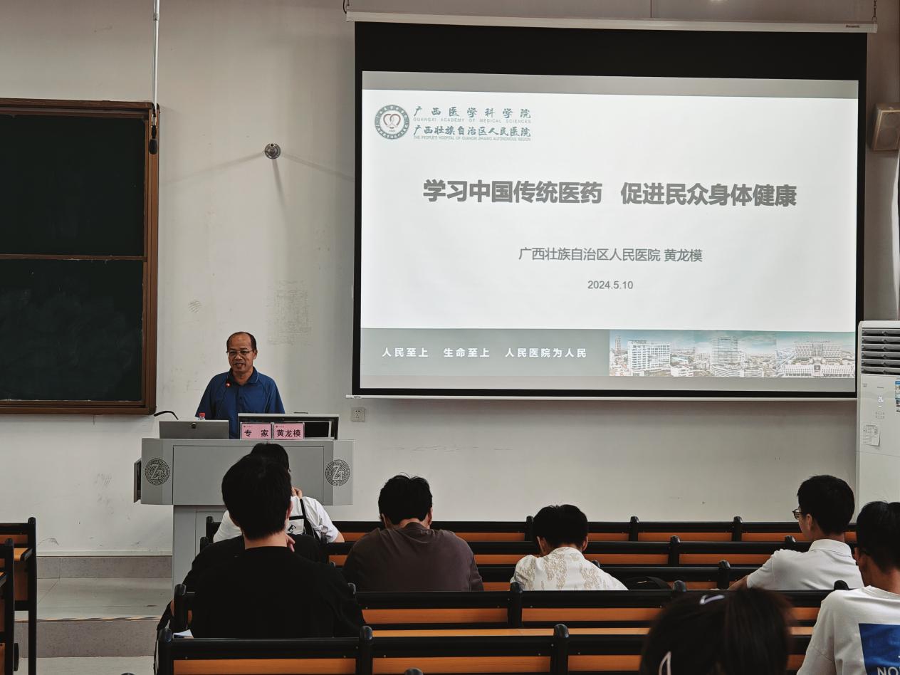 为弘扬中医文化的独特价值和卓越成就,提高公众对中医的认知度,“学习中国传统医学,促进民众身体健康”主题讲座于5月10日上午在武鸣校区A1-408大教室举行。本次讲座由伟德国际1946社团——习近平新时代中国特色社会主义思想青年理论研究会举办,全科医公司2022级70班及各院系师生近140人参加。专题讲座由广西壮族自治区人民医院中医科副主任、主任医师黄龙模主讲,研究会指导老师黄一鸣主持。