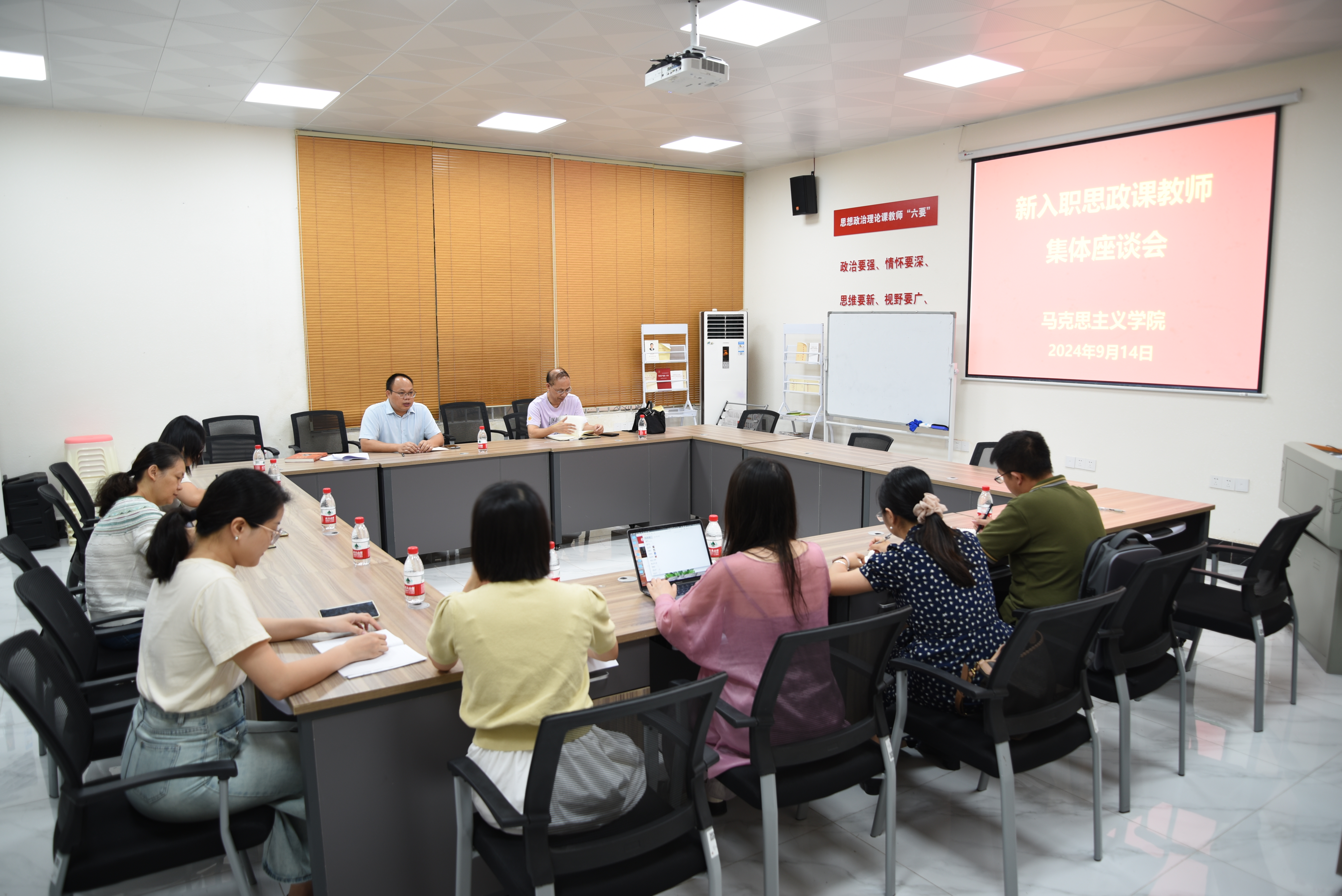 9月14日上午,伟德国际1946在人文楼103会议室召开新入职思政课教师座谈会。公司党委书记陈会方、公司副经理陈飞、院办和教研科负责人以及2024年新入职思政课教师参加了座谈会。会议由陈会方主持。