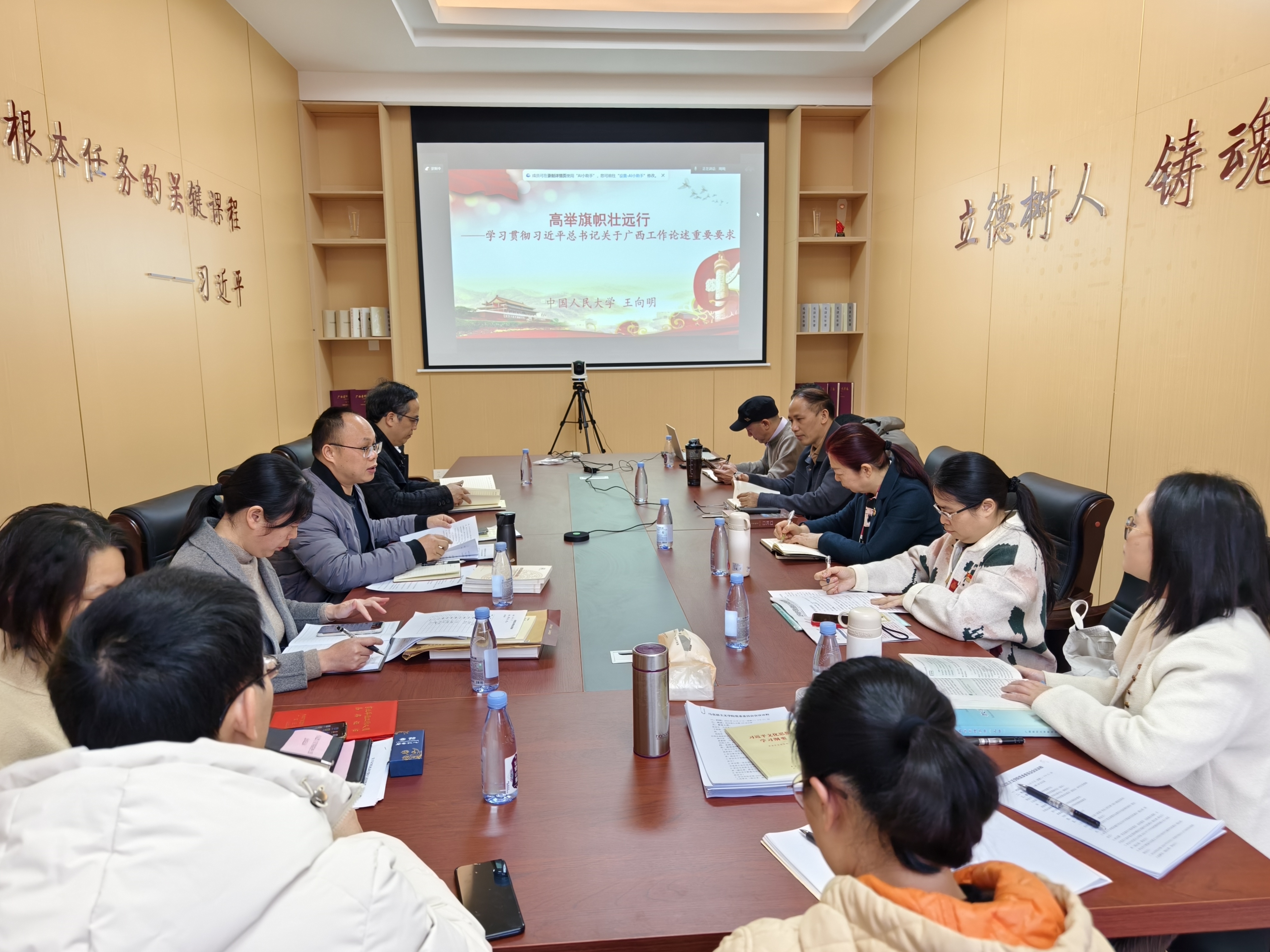 会上,王向明教授为与会人员作了《高举旗帜壮远行——学习贯彻习近平总书记关于广西工作论述的重要要求》的专题辅导。王向明教授以视频《壮美之路》为切入点,阐释了广西是“一带一路”有机衔接的重要门户、要做“高质量发展”的排头兵、要保护好生态环境、要做民族团结示范区、要以改革创新推动教育发展等方面的内容,对公司进一步提高医公司校伟德国际1946高质量发展,主动融入服务“一区两地一园一通道”建设提供了建设性指导。